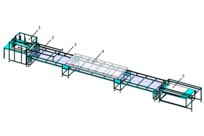 Hình 1: Thiết kế hoàn chỉnh máy tự động in và sấy Logo (1) Cơ cấu in, (2) Cấu tay kẹp, (3) Băng tải, (4) Buồng sấy, (5) Cơ cấu sắp xếp |
