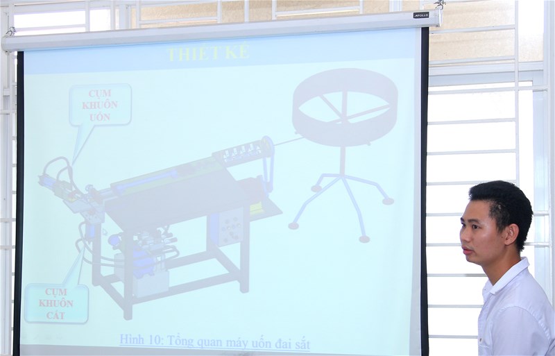 Hình 4. Sinh viên Trần Đức Diện đang báo cáo đề tài "Nghiên cứu, thiết kế và chế tạo máy cơ khí".