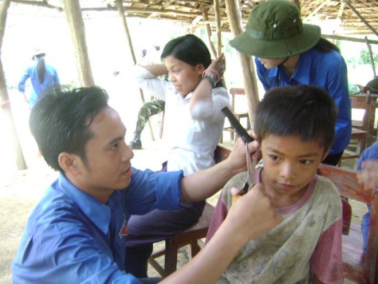 Đồng chí Lê Sơn Quang - Phó Bí Thư Đoàn Trường - cắt tóc cho các em nhỏ