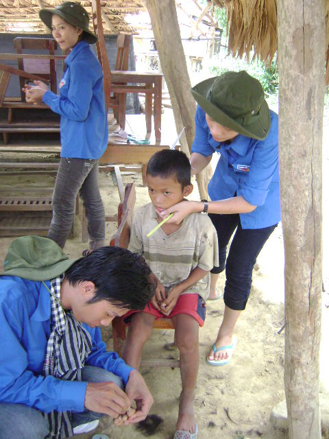 Ngày đầu tiên trong thôn, chúng tôi tìm hiểu cuộc sống và phong tục tập quán và sự khó khăn của dân tộc Vân Kiều. không để lỡ thời gian, chúng tôi lên kế hoạch hoạt động ngay sau khi ăn cơm. Chúng tôi đã tiến hành cắt tóc, cắt móng tay, móng chân và tắm cho trẻ em trong thôn. Nhìn những đứa trẻ mặt mũi nhơ nhuốc, đen nhẻm được gội rửa sạch sau khi được cắt và được tắm gội, chúng tôi cảm thấy rất vui. Trẻ em đến rất đông, phần lớn đã quen với sụ hiện diện của chúng tôi( tuy cũng có những đứa trẻ khóc ré lên khi chúng tôi đề nghị cắt tóc).