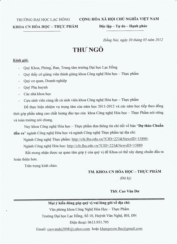 Khoa Công nghệ Hóa học và Thực phẩm: Thư ngỏ "V/v góp ý xây dựng chuẩn đầu ra"