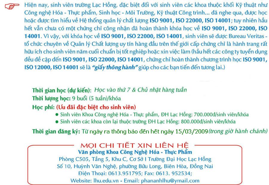 Trường Đại học Lạc Hồng – Tiếp tục chiêu sinh khóa đào tạo ISO 9001, ISO 22000 ISO 14001