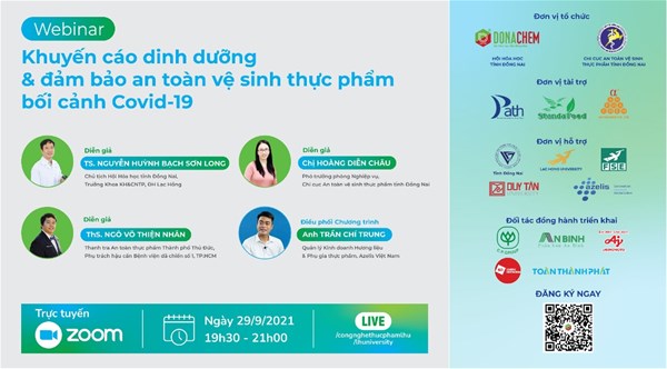 Webinar "KHUYẾN CÁO DINH DƯỠNG & ĐẢM BẢO AN TOÀN VỆ SINH THỰC PHẨM BỐI CẢNH COVID-19" diễn ra vào tối 19:30 ngày 29/9/2021, được tổ chức bởi Đơn vị: Hội Hóa học tỉnh Đồng Nai và Chi cục ATVSTP tỉnh Đồng Nai;