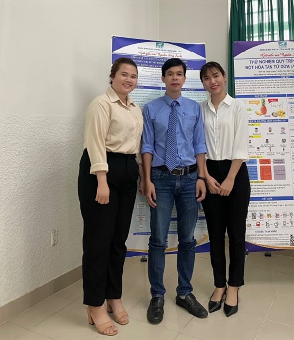 Thúy cùng bạn đồng hành NCKH và Thầy Bùi Trường Đạt, GV hướng dẫn đề tài