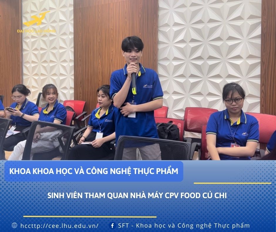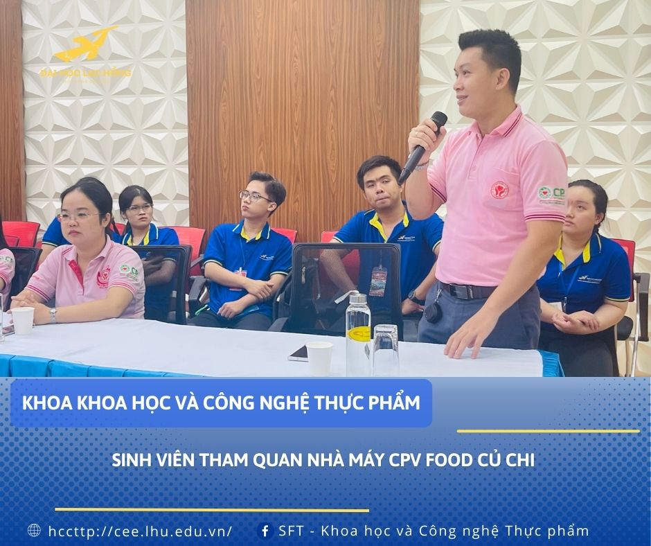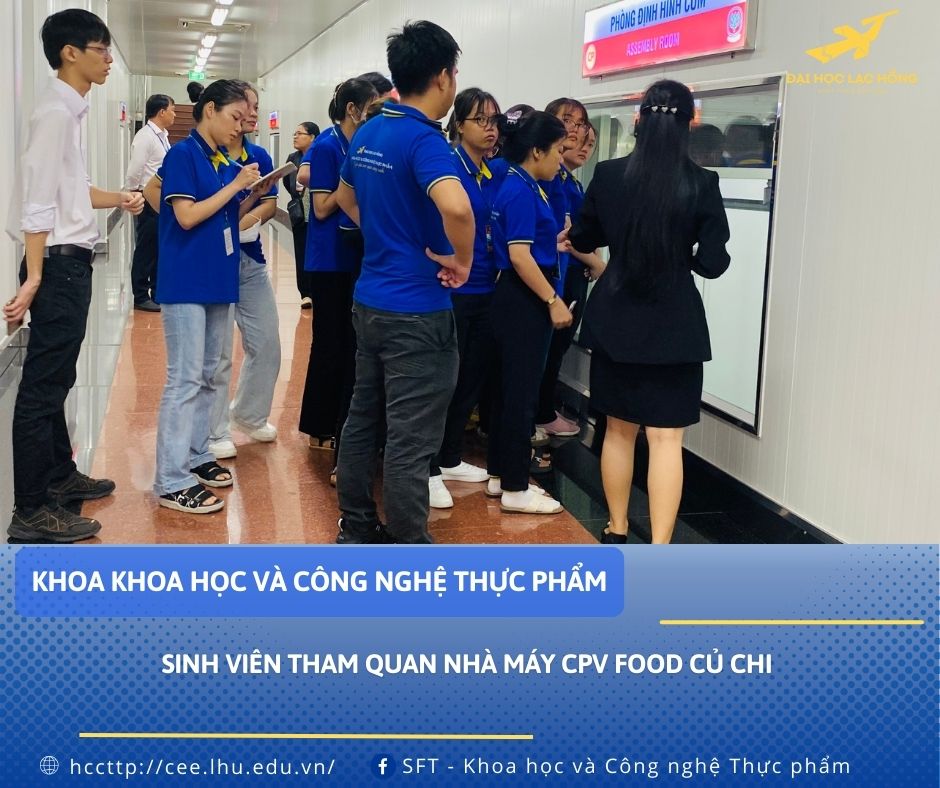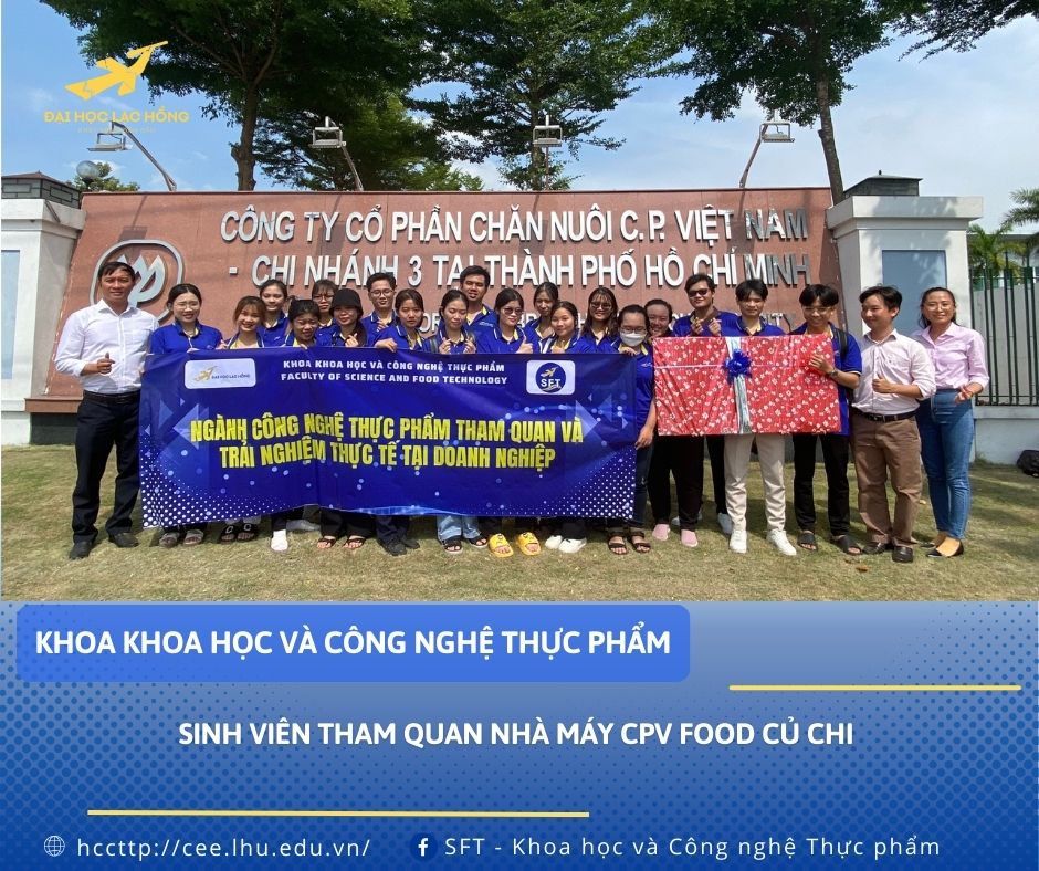 Ngày 13/5/2024 sinh viên năm ba, ngành Công nghệ thực phẩm, Khoa Khoa học & Công nghệ thực phẩm, trường Đại Học Lạc Hồng đi tham quan Nhà Máy CPV Food Củ Chi thuộc Công Ty Cổ Phần Chăn Nuôi C.P Việt Nam. Qua chuyến tham quan này, sinh viên có thêm nhiều kiến thức thực tế và có nhiều tư liệu phục vụ cho môn Thực tập quá trình và Công nghệ thực phẩm.