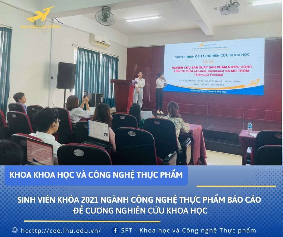 Ngày 7/9/2024 Khoa khoa học & CN Thực phẩm tổ chức thành công buổi báo cáo đề cương nghiên cứu khoa học cho sinh viên khóa 2021 ngành Công nghệ thực phẩm. Tại khóa 2021 có 100% các bạn sinh viên tham gia nghiên cứu khoa học, điều này chứng tỏ chất lượng đào tạo của Khoa ngày càng được cải tiến và đáp ứng được nhu cầu người học và xã hội.