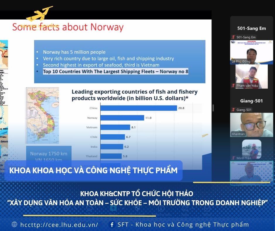 • Ngày 05/5/2025 khoa KH&CNTP đã phối hợp cùng Mr. Teddy Broadhurst – CEO of HSE Excellence Ltd, Norway và Mr. Trần Việt Nhân – Tutor, BSI Vietnam tổ chức hội thảo “Xây dựng văn hóa An toàn – Sức khỏe – Môi trường (HSE) trong doanh nghiệp”. Hội thảo với hình thức online thu hút gần 200 đại diện các doanh nghiệp, tổ chức đào tạo, học viên và chuyên gia trong lĩnh vực HSE tại Việt Nam. Sự kiện được tổ chức nhằm thúc đẩy nhận thức và hành động thực tiễn trong việc xây dựng văn hóa HSE – một yếu tố nền tảng trong chiến lược phát triển bền vững của doanh nghiệp hiện đại. Hội thảo không chỉ tập trung vào các yêu cầu pháp lý mà còn nhấn mạnh vai trò của HSE như một phần văn hóa cốt lõi trong mọi hoạt động sản xuất, kinh doanh.