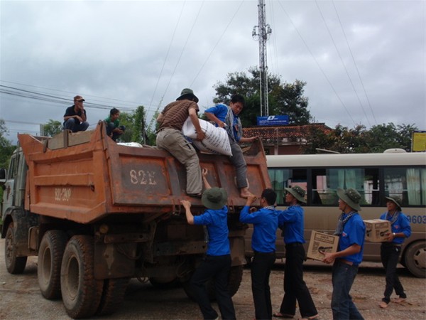Hình 12: Những bao gạo, thùng nước mắm cuối cùng đã được các chiến sĩ đưa lên xe trung chuyển