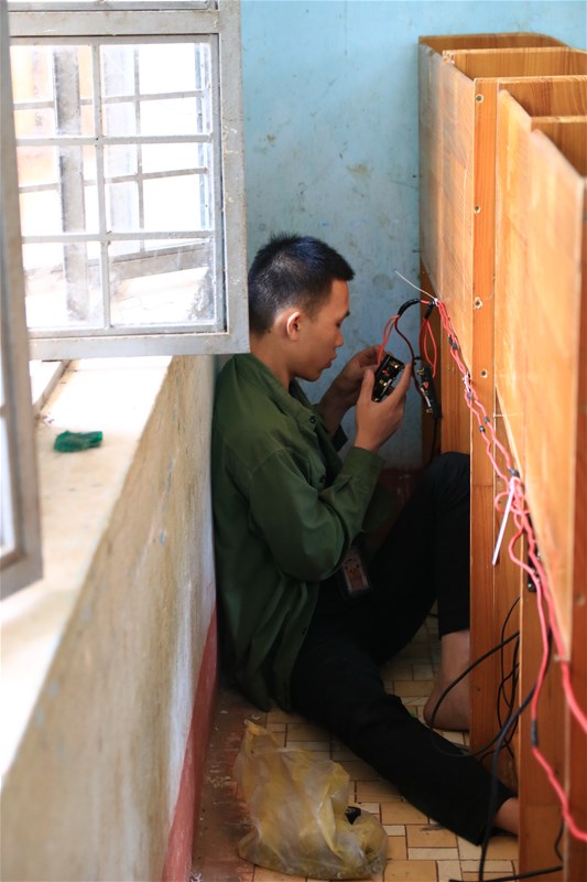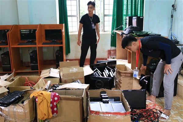 Bên trong căn phòng nhỏ chỉ gần 40 mét vuông chất đầy những thùng CPU, màn hình máy vi tính cũ. Các Chiến sỹ tình nguyện mỗi người mỗi việc, người thì sắp xếp lại máy, người thì lau chùi linh kiện, bàn phím, chuột,… tạo nên một không khí sôi nổi. Tại góc nhỏ của căn phòng, một nhóm 3 Chiến sỹ đang loay hoay vệ sinh lại một lần nữa những chiếc CPU, màn hình, bàn phím trong quá trình vận chuyển bám đầy bụi, rồi lấy linh kiện gắn vào máy chạy thử lại lần cuối trước khi trao tặng.