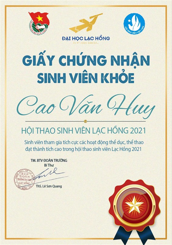 Ngoài ra, BTC còn trao Giấy chứng nhận "Sinh viên khỏe" cho sinh viên tham gia tích cực các hoạt động thể dục, thể thao và đạt thành tích cao trong Hội thao Sinh viên LHU 2021.