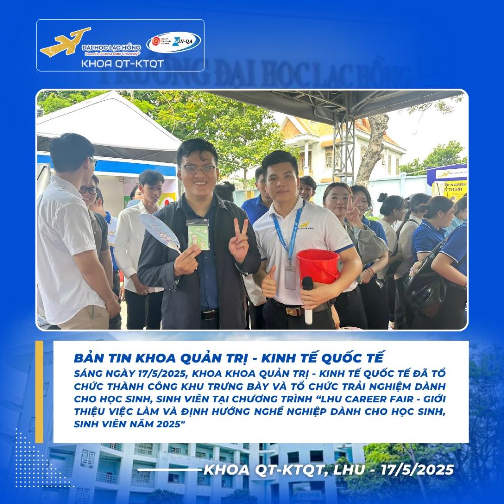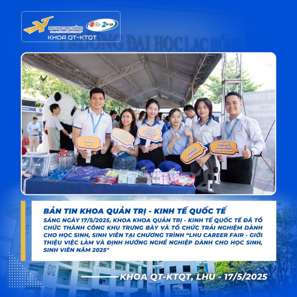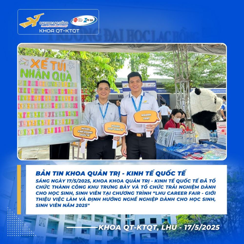 Trong khuôn khổ chương trình “LHU Career Fair 2025 – Ngày hội việc làm và định hướng nghề nghiệp dành cho học sinh, sinh viên”, gian hàng của Khoa Quản trị – Kinh tế quốc tế, Trường Đại học Lạc Hồng phối hợp cùng Đoàn – Hội Sinh viên Trường đã trở thành điểm đến nổi bật, thu hút đông đảo học sinh THPT và sinh viên đến tham quan, giao lưu và tìm hiểu cơ hội nghề nghiệp.