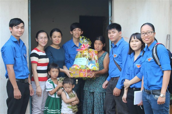 Anh Võ Chí Công chính giữa, cùng thầy cô và các bạn đoàn viên trao tặng quà Tết cho các hộ gia đình có hoàn cảnh khó khăn