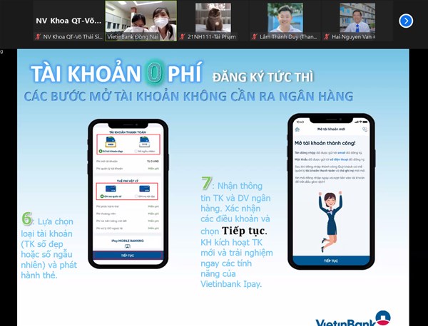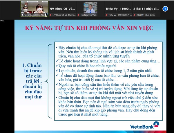 Tìm việc làm không khó, nhưng để có một công việc phù hợp với bản thân không phải điều dễ dàng. Do vậy, nếu tìm được công việc phù hợp thì đừng đánh mất cơ hội chỉ vì sự thiếu tự tin của bản thân. Bà Đặng Ngọc Quyên - Trưởng phòng kế toán chia sẻ những kỹ năng cần thiết để sinh viên tự tin khi phỏng vấn xin như là: chuẩn bị chu đáo các câu trả lời; nghĩ đến những điều tốt đẹp; luyện tập giọng nói; chuẩn bị trang phục phù hợp; tác phong, hành động dứt khoát, mạnh mẽ; thể hiện sự dễ mến, cởi mở; tương tác với người phỏng vấn…Tiếp nối chương trình, đại diện bên ngân hàng cũng đã giới thiệu các sản phẩm, dịch vụ, kết nối các bạn sinh viên đăng ký tham gia, mở tài khoản online, các dịch vụ khác khi tình hình dịch bệnh phức tạp chúng ta không thể trực tiếp đến ngân hàng. Bên cạnh đó, ngân hàng cũng đưa ra các mối nguy hại từ các tội phạm tinh vi, lừa gạt nhắm vào các đối tượng như sinh viên, phụ nữ và những người không được trang bị các kiến thức liên quan, cảnh báo đến các bạn sinh viên, đề phòng những rũi ro đáng tiếc xảy ra…