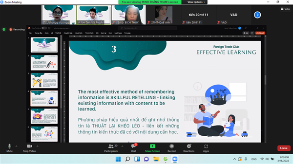 Vào 20 giờ 00 phút ngày 18 - 03 - 2022. Chương trình sinh hoạt đã diễn ra với sự tham gia của hơn 30 sinh viên với chủ đề “Một số phương pháp học tập hiệu quả cho sinh viên ngành ngoại thương”.
