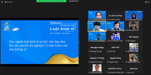 Vào lúc 19h00 ngày 04 tháng 08 năm 2022, ngành Luật Kinh Tế trường đại học Lạc Hồng đã tổ chức talkshow trực tuyến thông qua nền tảng zoom với chủ đề “Định hướng ngành học Luật Kinh Tế" tại trường Đại Học Lạc Hồng với mong muốn giúp các bạn học sinh khối 12 hiểu rõ hơn về ngành luật kinh tế. Từ đó giúp các bạn có thể dễ dàng tiếp cận, hình dung được phần nào về ngành Luật kinh tế để có thể lựa chọn cho mình ngành học phù hợp với bản thân, định hướng của mình.