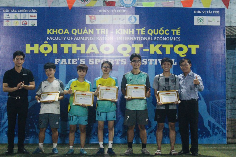 Trong chương trình Bế mạc Khoa QT-KTQT, BTC cũng đã trao tặng bằng khen, huy chương và các món quà lưu niệm cho đội bóng nam xuất sắc gồm 4 giải: Nhất, Nhì, Ba, Tư và 2 đội bóng nữ xuất sắc gồm có 2 giải Nhất và Nhì. Bên cạnh đó BTC cũng khen thưởng và trao tặng những món quà cho các cá nhân có thành tích xuất sắc trong Hội thao vừa qua gồm các giải như: Thủ môn xuất sắc nhất, cầu thủ xuất sắc nhất và giải phong cách tấm ảnh được quan tâm, ủng hộ nhiều nhất.