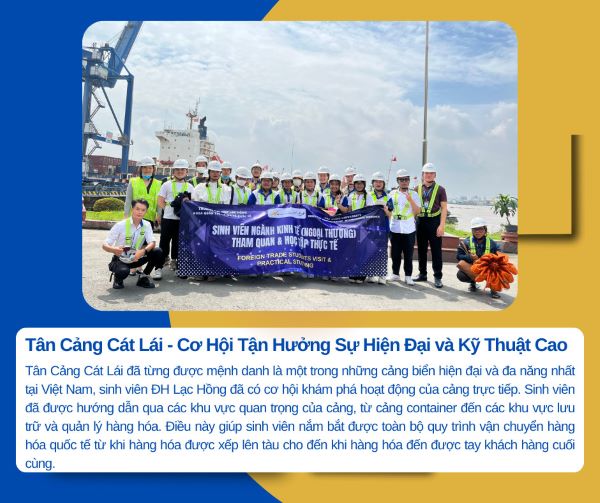 Một trải nghiệm thực tế đáng nhớ đã diễn ra, khi sinh viên ngành Kinh tế (Ngoại thương) đã có cơ hội tham quan và học tập tại Tân Cảng Cát Lái, Thành phố Hồ Chí Minh. Chuyến tham quan này là một phần quá trình giảng dạy và học tập đa dạng, nhằm giúp sinh viên hiểu rõ hơn về thực tế trong lĩnh vực quản lý thương mại quốc tế và hệ thống vận chuyển hàng hóa.