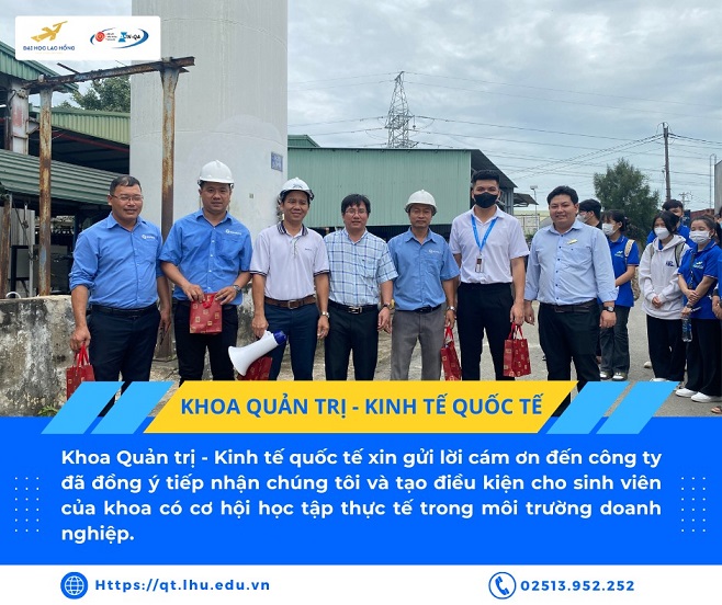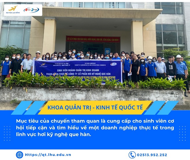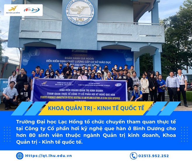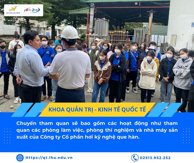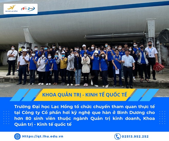 Trường Đại học Lạc Hồng tổ chức chuyến tham quan thực tế tại Công ty Cổ phần hơi kỹ nghệ que hàn ở Bình Dương cho hơn 80 sinh viên thuộc ngành Quản trị kinh doanh, Khoa Quản trị - Kinh tế quốc tế. Chuyến tham quan này do Thầy TS. Nguyễn Văn Dũng - Trưởng ngành Quản trị kinh doanh đảm nhận vai trò trưởng đoàn, phối hợp với Bộ phận Quan hệ doanh nghiệp và hỗ trợ sinh viên của trường, khoa, cùng với quý thầy cô là bộ môn và giảng viên ngành.