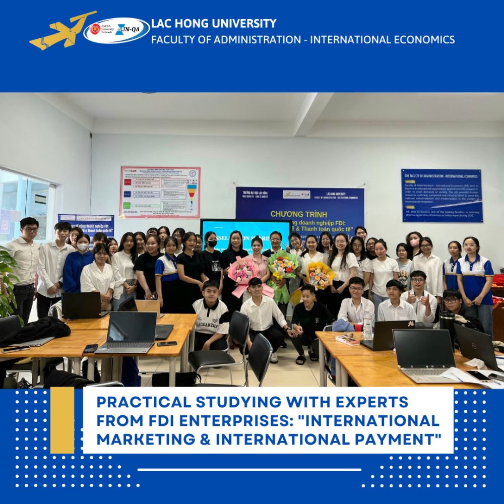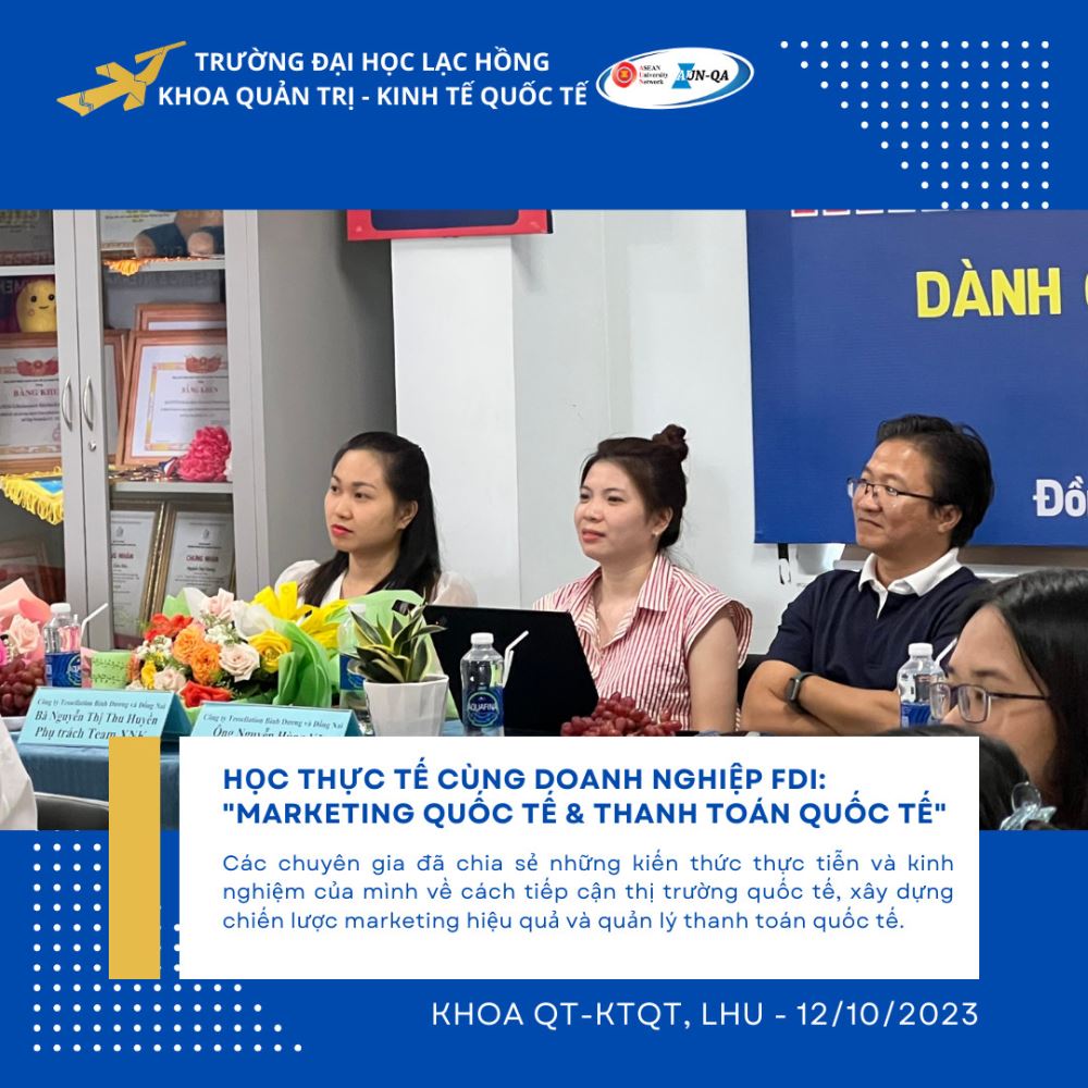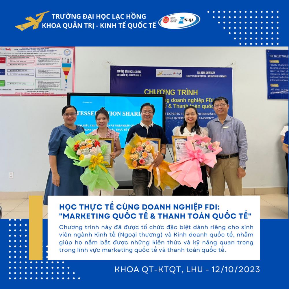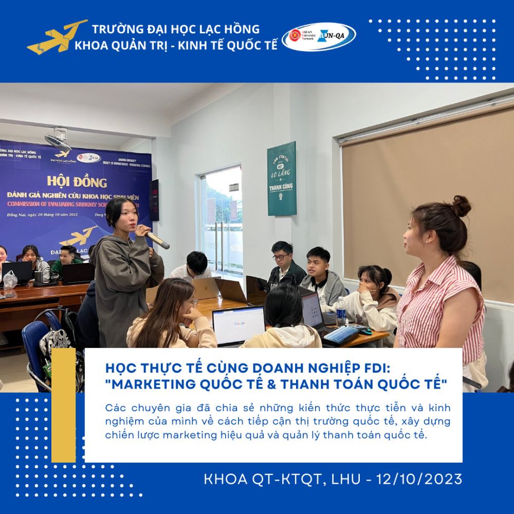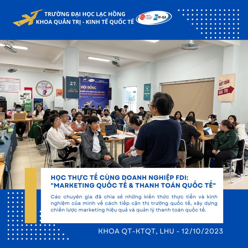 Chương trình Học thực tế cùng doanh nghiệp FDI: "Marketing quốc tế & Thanh toán quốc tế" đã diễn ra vào ngày 12/10/2023 tại khoa Quản trị - Kinh tế quốc tế, Trường đại học Lạc Hồng. Chương trình này đã được tổ chức đặc biệt dành riêng cho sinh viên ngành Kinh tế (Ngoại thương) và Kinh doanh quốc tế, nhằm giúp họ nắm bắt được những kiến thức và kỹ năng quan trọng trong lĩnh vực marketing quốc tế và thanh toán quốc tế.