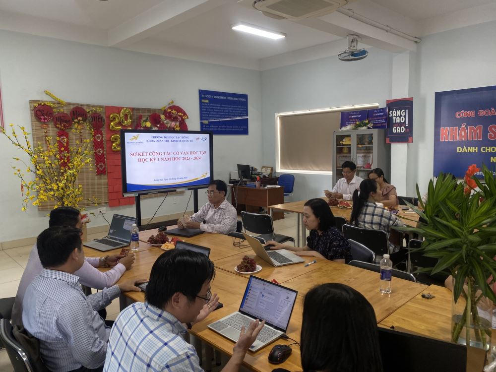Vào ngày 26/01/2024, Khoa Quản trị - Kinh tế quốc tế, Trường Đại học Lạc Hồng đã tổ chức Sơ kết công tác cố vấn học tập cho học kỳ 1 năm học 2023-2024. Chương trình này nhằm tạo ra một môi trường học tập tốt nhất cho sinh viên và nâng cao chất lượng cố vấn học tập.