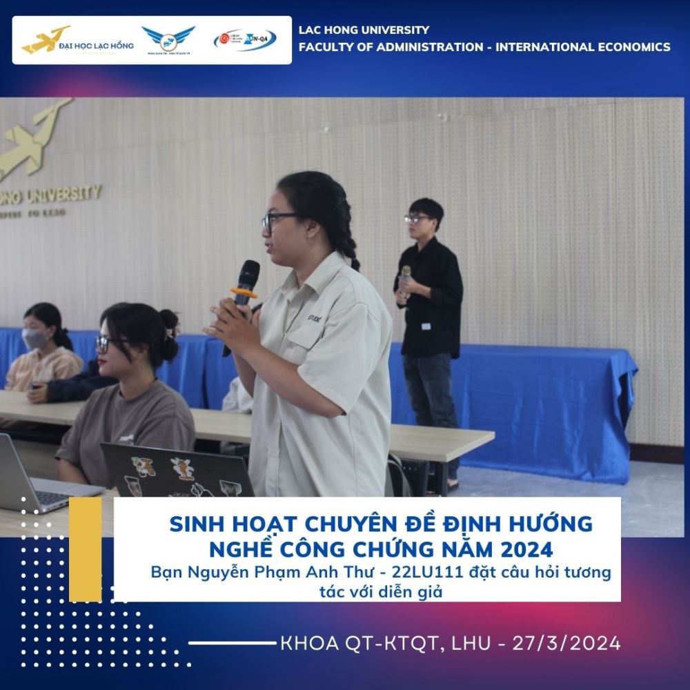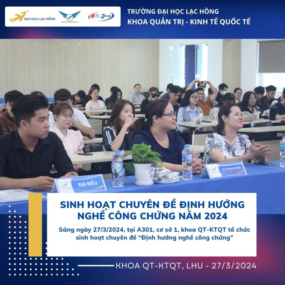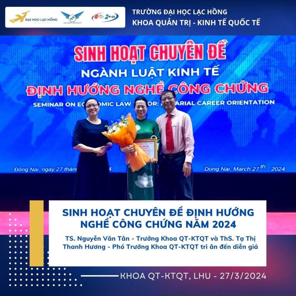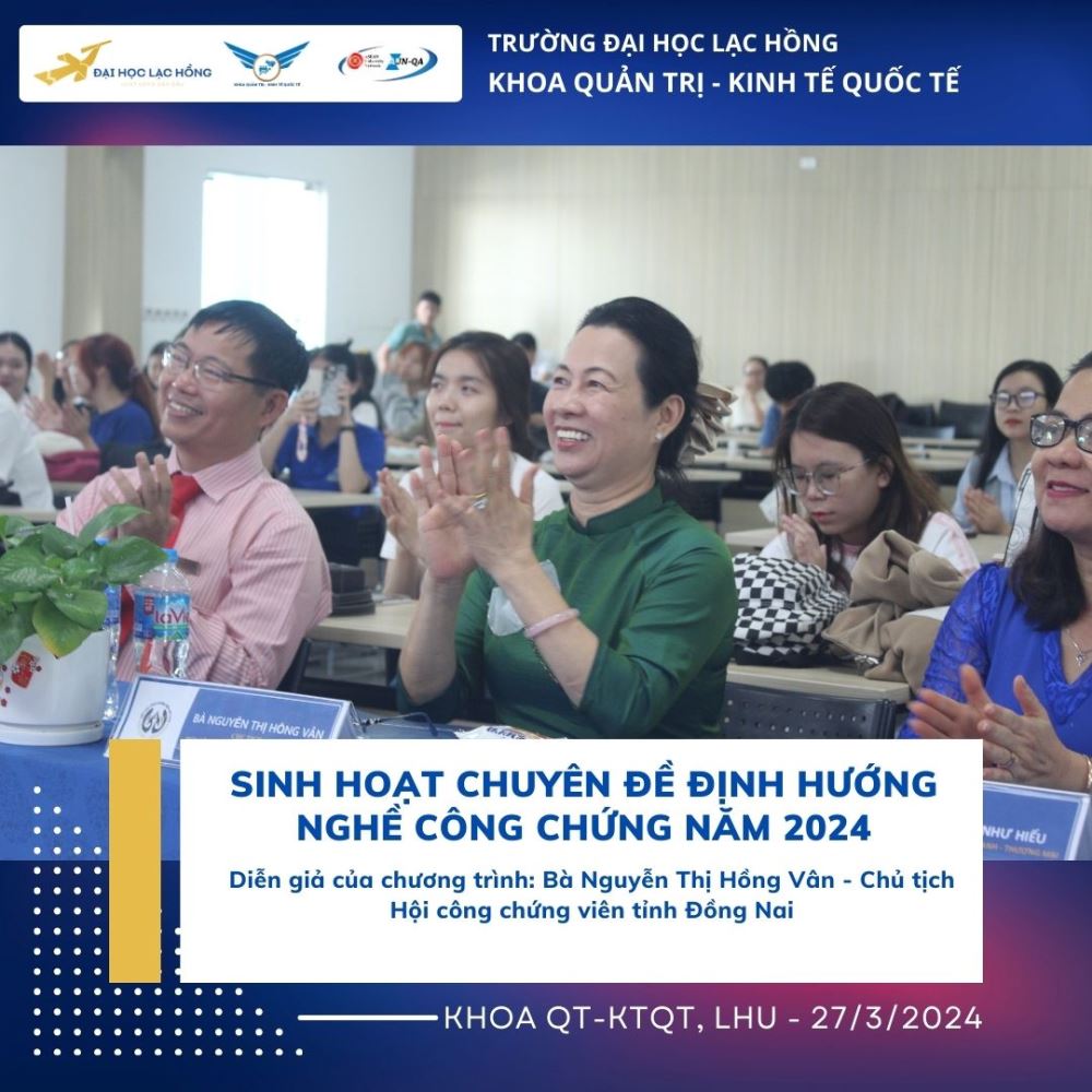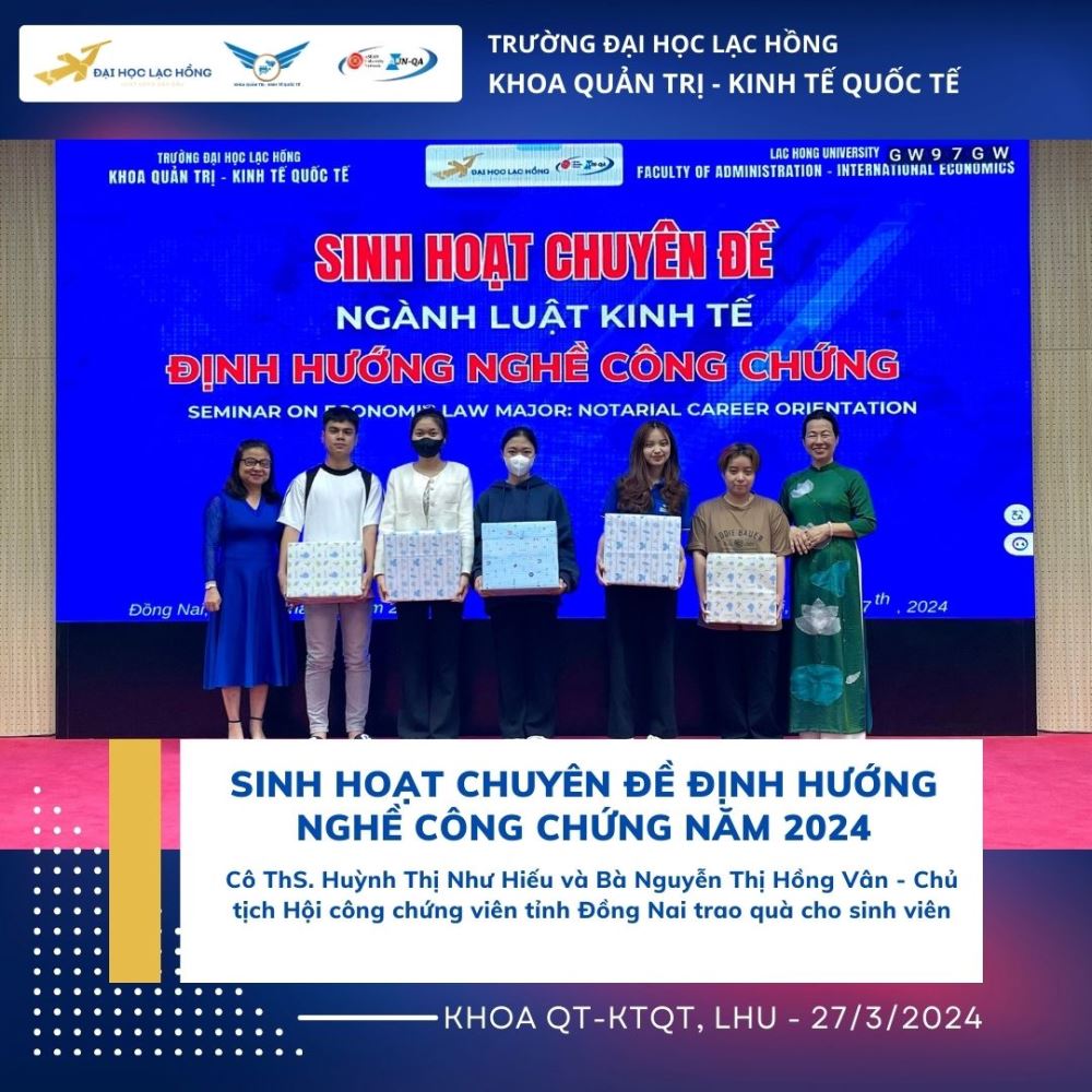 Công chứng là một hoạt động quan trọng trong việc xác lập giá trị pháp lý của văn bản, công chứng viên đóng vai trò quan trọng trong việc xác thực tính pháp lý của tài liệu, văn bản, góp phần nâng cao giá trị pháp lý của các văn bản được xác lập. Nhằm trang bị những kỹ năng, kiến thức cũng như những kinh nghiệm quý báu về nghề Công chứng viên. Vào ngày 27 tháng 03 năm 2024 tại phòng A301, cơ sở 1 của Trường Đại học Lạc Hồng, Khoa Quản trị - Kinh tế Quốc tế đã tổ chức buổi sinh hoạt chuyên đề “Định hướng nghề công chứng”. Chương trình chào đón sự tham gia của bà Nguyễn Thị Hồng Vân – Chủ tịch Hội Công chứng viên tỉnh Đồng Nai. Đây là một hoạt động thường niên của ngành để giúp cho sinh viên có cái nhìn tổng quan hơn để có thể tiếp cận gần hơn về kỹ năng, gắn kết việc học lý thuyết với thực tiễn, giúp sinh viên định hướng cho ngành nghề của mình. Đó là tiền đề để sinh viên có thể phát huy trong môi trường hành nghề Công chứng viên hiện nay.