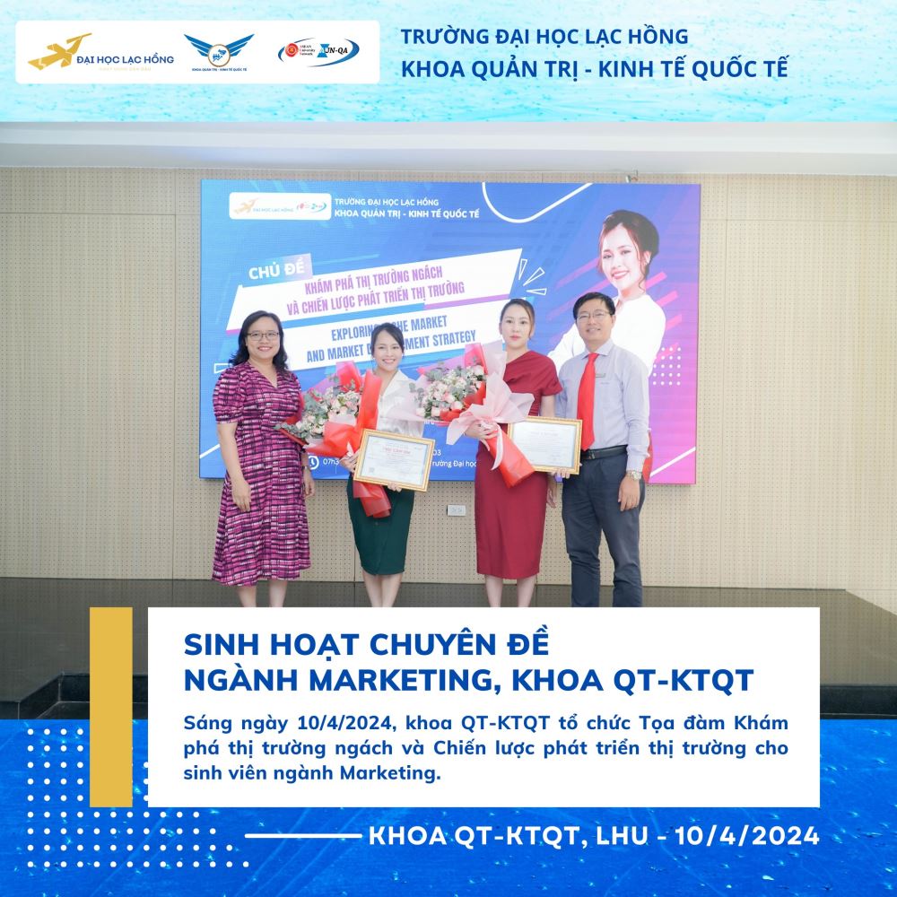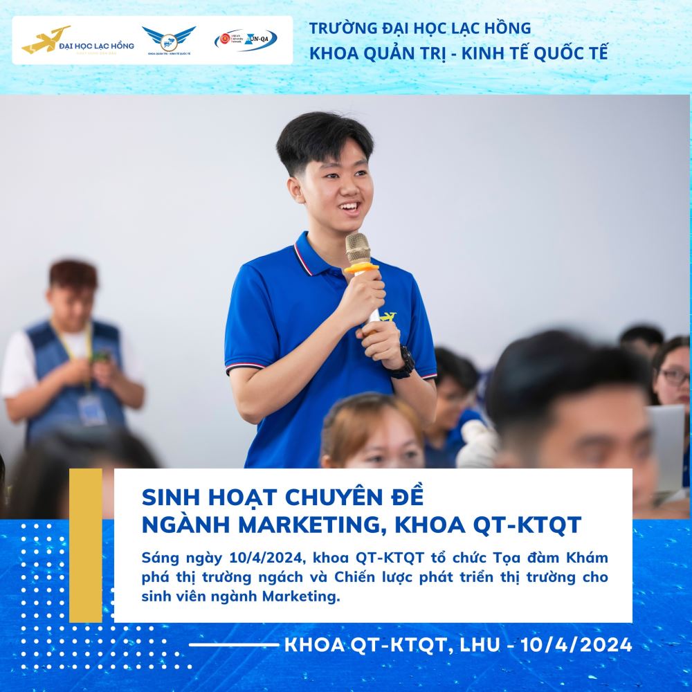 Khoa Quản trị - Kinh tế quốc tế, Trường Đại học Lạc Hồng rất tự hào và biết ơn vì sự hỗ trợ của diễn giả, quý đơn vị và tổ chức của CLB ngành Marketing, đã mang đến cho sinh viên một buổi chuyên đề bổ ích và thú vị. Cùng nhau, chúng ta hướng tới mục tiêu xây dựng một ngành Marketing ngày càng phát triển và đáp ứng được nhu cầu của thị trường hiện nay.