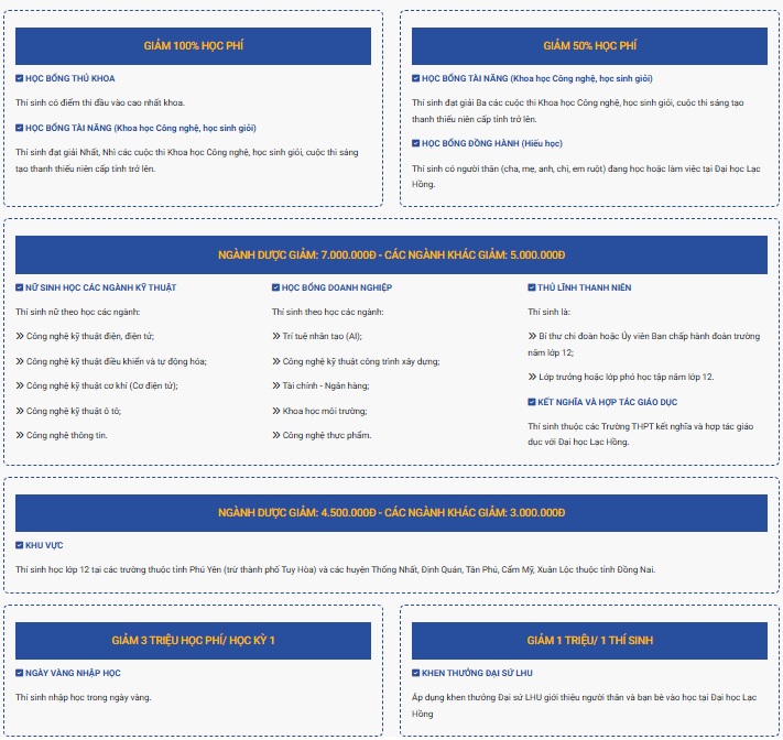 Tôi thấy chính sách duy trì học bổng nhập học cho sinh viên tại trường đại học Lạc Hồng rất hay và ý nghĩa, không phải trường nào cũng có, trong khi mức học phí ở các trường đều rất cao, điều này đã giúp đỡ đần cho sinh viên rất nhiều, tạo thêm động lực cho sinh viên học tập. Ngoài chính sách học bổng nhập học này tôi cũng rất cảm ơn nhà trường về chính sách vay Mabuchi với lãi suất 0%. Tuy chính sách này chỉ dành cho vài chục bạn tân sinh viên, và số tiền mỗi lần vay không quá cao nhưng đây cũng là một phần giúp tôi ổn định chi phí học tập cho mình.