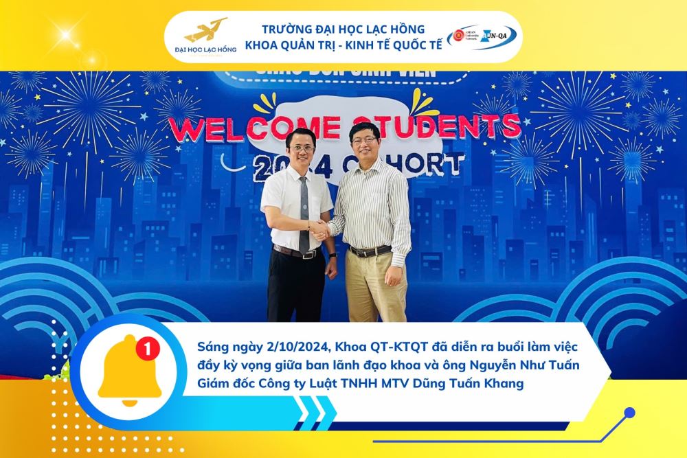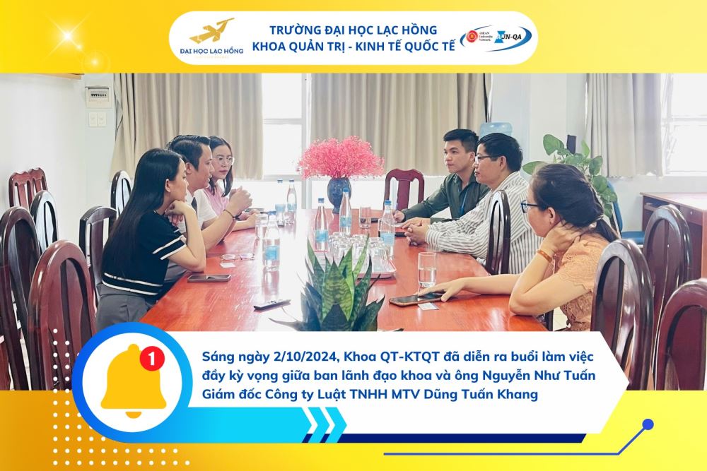 Sáng ngày 2/10/2024, tại Khoa Quản trị - Kinh tế quốc tế, Trường Đại học Lạc Hồng đã diễn ra buổi làm việc đầy kỳ vọng giữa ban lãnh đạo khoa và ông Nguyễn Như Tuấn – Giám đốc Công ty Luật TNHH MTV Dũng Tuấn Khang. Buổi gặp gỡ không chỉ mang đến những giá trị thiết thực mà còn mở ra nhiều hướng đi mới trong việc kết nối giữa sinh viên và doanh nghiệp.