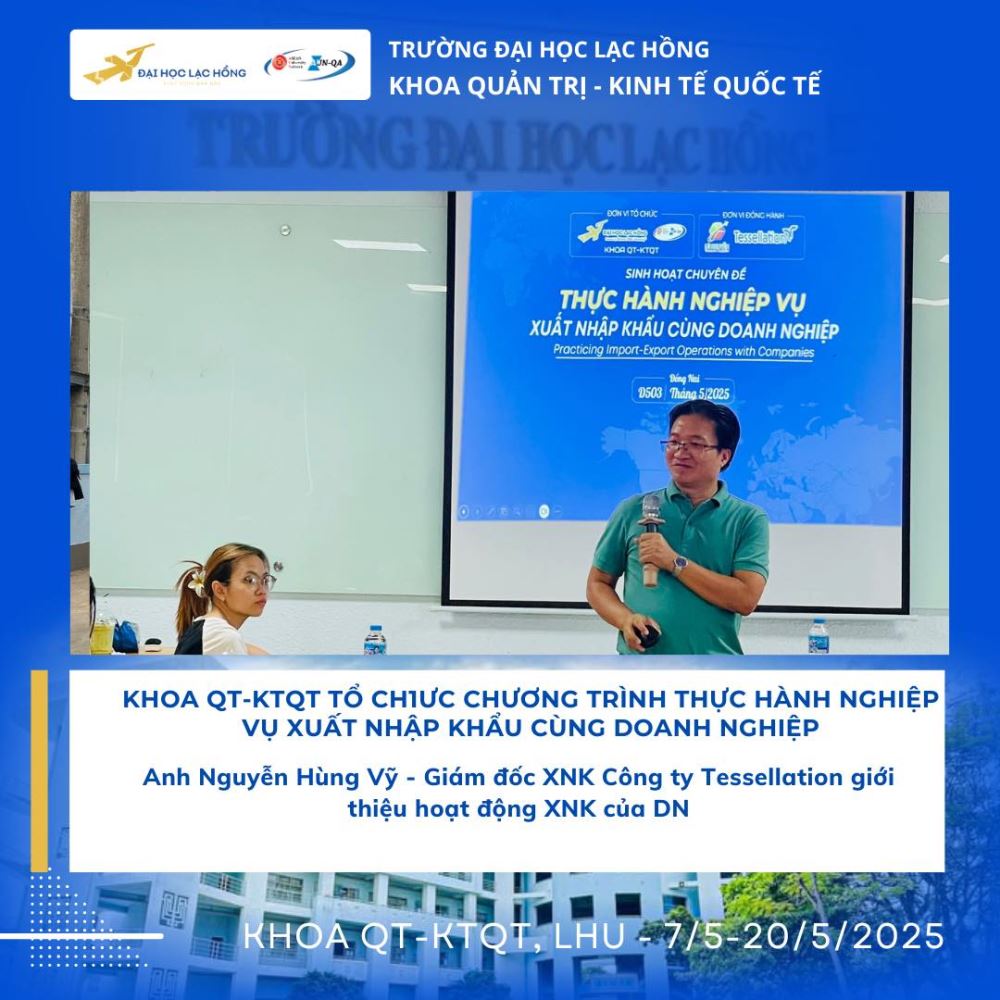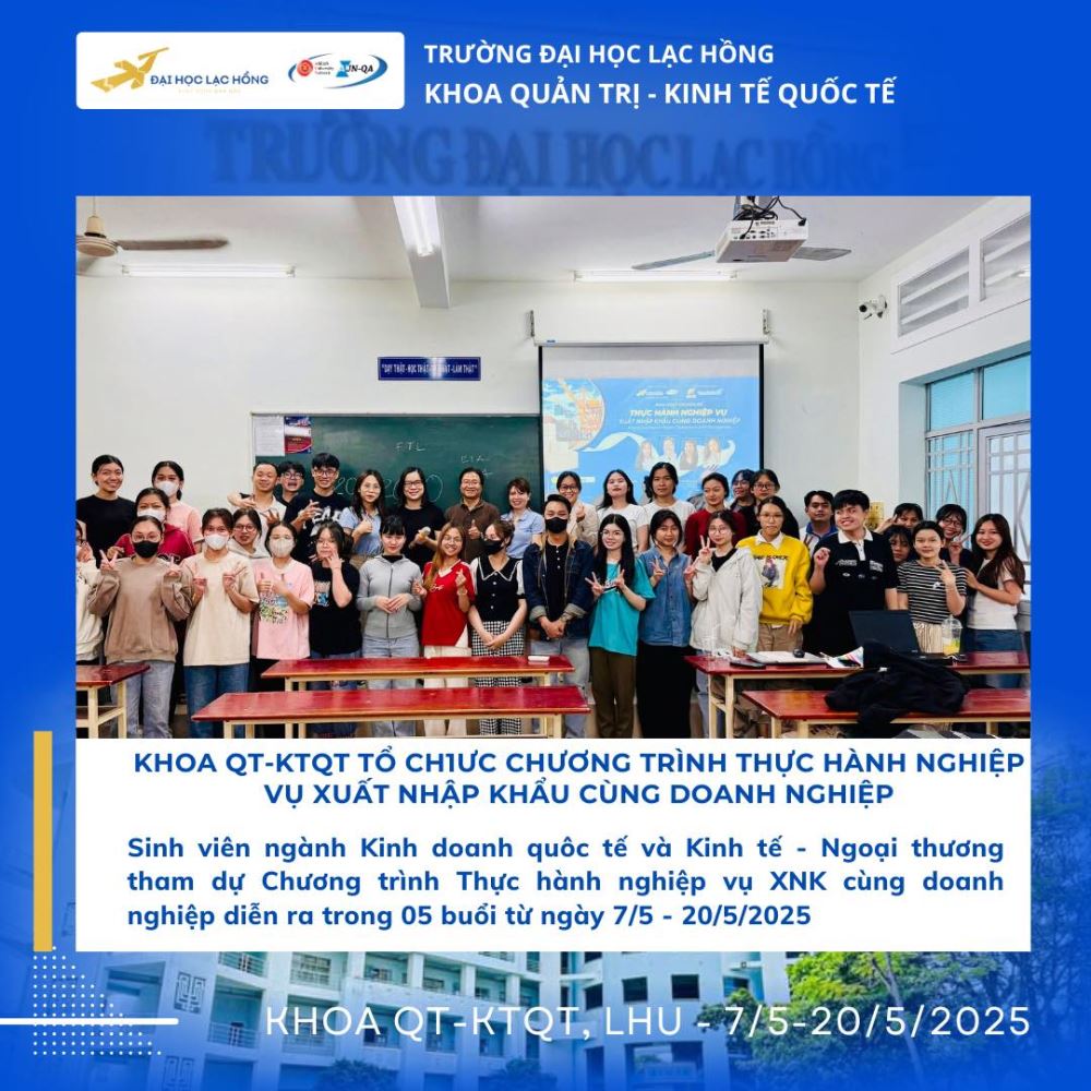 Nhằm trang bị cho sinh viên những kỹ năng thực tiễn và tạo cầu nối vững chắc với doanh nghiệp, Khoa Quản trị - Kinh tế Quốc tế đã tổ chức thành công chương trình “Thực hành nghiệp vụ xuất nhập khẩu cùng doanh nghiệp”. Chương trình diễn ra trong 5 buổi, từ ngày 14/5/2025 đến ngày 20/5/2025, tại Cơ sở 2 của trường, thu hút sự tham gia nhiệt tình của giảng viên, chuyên gia và đông đảo sinh viên ngành Kinh doanh quốc tế và Kinh tế - Ngoại thương.