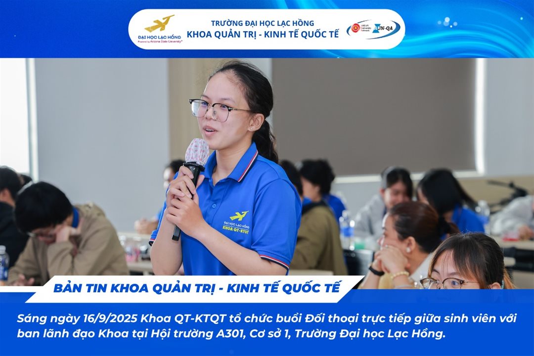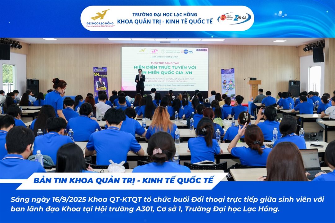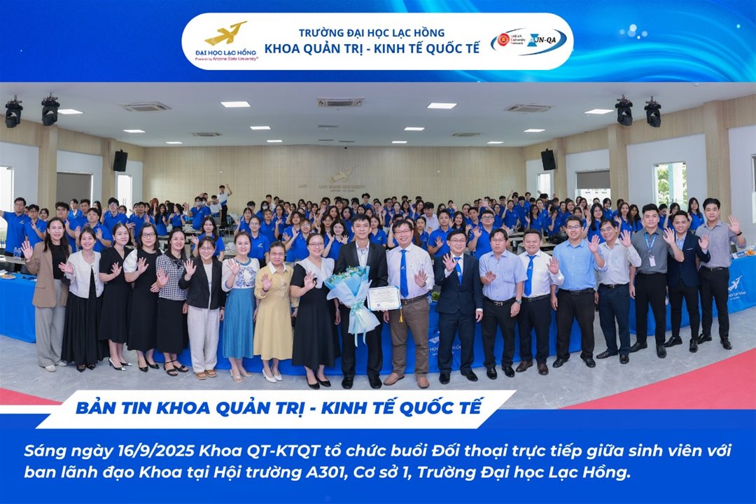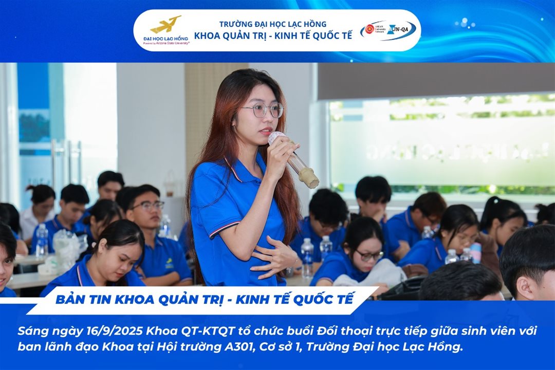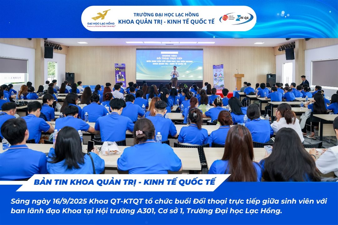 Sáng ngày 16/9/2025, tại hội trường A301 – Cơ sở 1, Trường Đại học Lạc Hồng, Khoa Quản trị – Kinh tế Quốc tế đã tổ chức chương trình “Đối thoại trực tiếp giữa sinh viên và Ban lãnh đạo khoa năm học 2025 – 2026”.