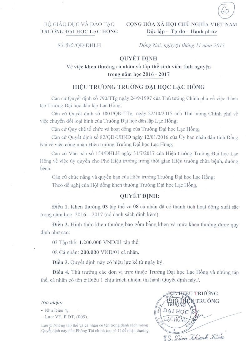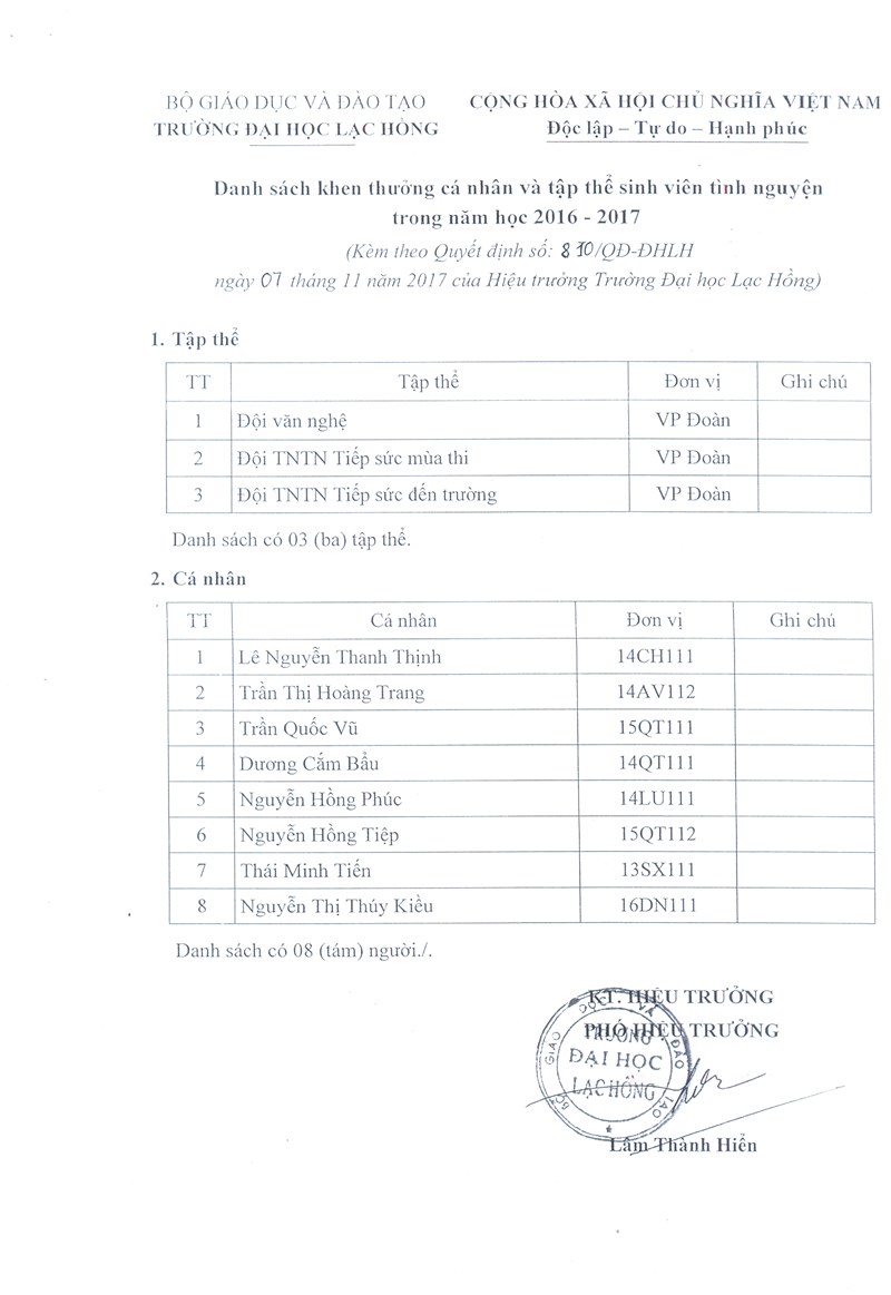 QĐ Khen thưởng của trường cho CLB, Đội nhóm, SVTN 2016 - 2017