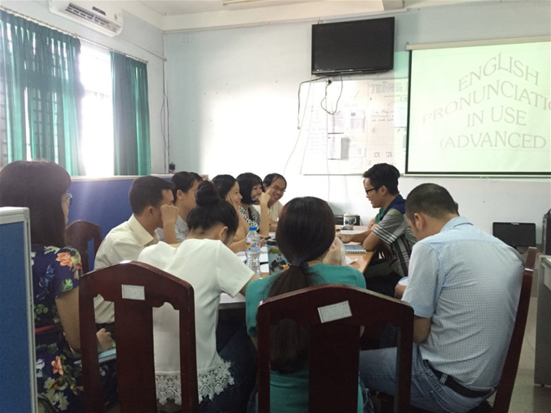 Trong kế hoạch lâu dài về chuẩn hóa các hoạt động chuyên môn như biên soạn bài giảng, soạn đề thi, viết giáo trình môn học, nâng cao năng lực kiểm tra, đánh giá, bổ sung những vấn đề về chuyên môn nghiệp vụ mà giáo viên còn thiếu hoặc yếu, khoa Ngôn ngữ Anh thường xuyên tổ chức sinh hoạt chuyên môn vào thứ sáu hàng tuần. Tiếp theo các buổi sinh hoạt với những chuyên đề như ‘ Một số vấn đề cần chú ý khi thiết kế bài thi các môn Nghe , Nói, Đọc , Viết ở các trình độ’ , ‘ cách thiết kế bài thi và đánh giá sinh viên trong môn Nói Thương Mại’ , ‘những điểm cần chú ý trong môn Ngữ Âm 1’…, vào lúc 14h00 ngày 22.4.2016, tại phòng SN-C101, khoa Ngôn ngữ Anh đã tổ chức  buổi sinh hoạt với chuyên đề ‘Ngữ  âm ở trình độ  cao và những nội dung được đánh giá trong kỳ thi môn Pronunciation 2”.  Buổi sinh hoạt không chỉ nâng cao năng lực chuyên môn nghiệp vụ cho các giáo viên trong khoa, mà còn giúp  đảm bảo tính chính xác, công bằng trong kiểm tra, đánh giá môn học này. Sau đây là một số hình ảnh: