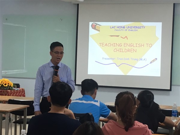 Chúng ta đều biết tiếng Anh là ngôn ngữ toàn cầu và việc phát triển ngoại ngữ cho trẻ cần được chú trọng. Ngoại ngữ chính là điều kiện quan trọng để con có thể tiếp cận và cập nhật nguồn tri thức từ khắp mọi nơi trên thế giới. Cho đến nay, Việt nam cũng đã bắt đầu sử dụng Tiếng Anh phổ biến hơn. Dường như tiếng Anh đã trở thành tấm vé thông hành hữu dụng giúp trẻ tự tin trong giao tiếp và thỏa sức khám phá màu sắc đa dạng từ các nền văn hóa các nước khác. Phát triển ngôn ngữ có tầm quan trọng rất lớn đặc biệt là đối với trẻ ngay từ khi còn nhỏ bởi ngôn ngữ tác động trực tiếp đến trẻ và giúp trẻ phát triển toàn diện hơn. Ngày nay, rất nhiều bậc phụ huynh đã và đang cho con em mình học tiếng Anh ngay từ khi còn nhỏ. Bên cạnh việc tự dạy cho con học Anh văn tại nhà thì việc tìm cho con một trung tâm Anh ngữ uy tín và chất lượng cũng là điều hết sức quan trọng. Cha mẹ dù có tâm huyết thế nào cũng không thể dành đủ thời gian để đồng hành cùng con trên suốt con đường học vấn. Chính vì thế, việc tìm cho con một nơi uy tín để nâng cao trình độ tiếng Anh cho con là vô cùng cần thiết. Những năm qua, các trung tâm ngoại ngữ chính là nơi nhiều phụ huynh đã an tâm gửi gấm con em mình. Nắm bắt được nhu cầu trên, hiện nay rất nhiều sinh viên khoa Ngôn ngữ Anh đã tìm đến công việc dạy tiếng Anh cho trẻ em tại các trung tâm ngoại ngữ trên địa bàn tỉnh. Để giúp sinh viên năm cuối trong toàn khoa biết cách dự tuyển làm giáo viên tại các trung tâm giảng dạy tiếng Anh và nắm bắt một số kỹ năng khi tham gia giảng dạy cho trẻ em, Khoa Ngôn ngữ Anh đã tổ chức chuyên đề hướng dẫn dạy tiếng Anh cho trẻ em do ThS. Trần Đình Trọng – Giám đốc Công Ty TNHH Ngoại Ngữ Lê Anh trình bày, diễn ra vào lúc 13h30, thứ bảy ngày 11 tháng 5 năm 2019 tại phòng D503, Cơ sở 2, Trường Đại học Lạc Hồng.