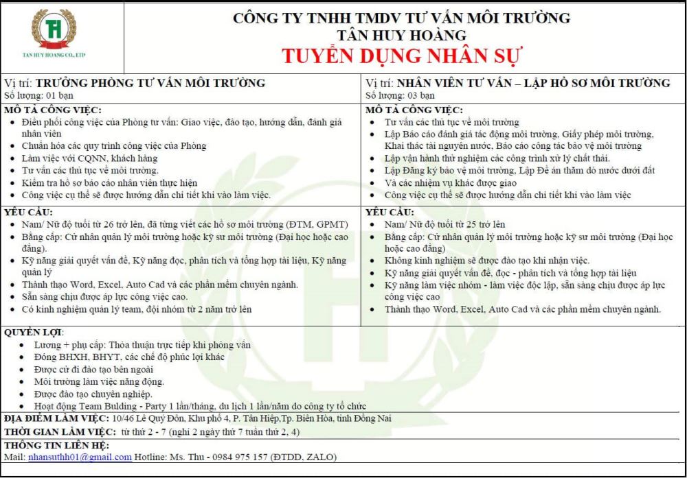 CÔNG TY TNHH TMDV TƯ VẤN MÔI TRƯỜNG TÂN HUY HOÀNG thông báo tuyển dụng nhân viên ngành Môi trường