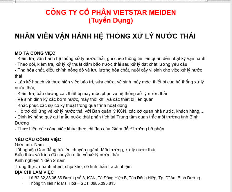 Công Ty Cổ Phần Vietstar Meiden thông báo tuyển dụng nhân viên môi trường