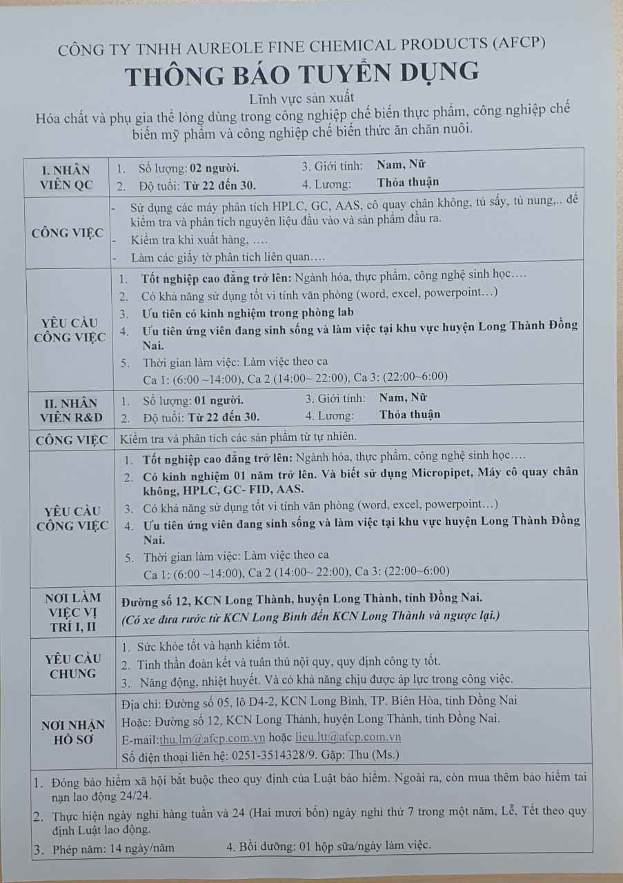 Công Ty TNHH AUREOLE FINE CHEMICAL PRODUCTS thông báo tuyển dụng nhân viên QC, QA ngành Công nghệ thực phẩm