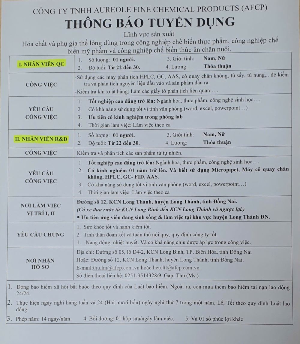 Công Ty TNHH AUREOLE FINE CHEMICAL PRODUCTS ( AFCP ) thông báo tuyển dụng nhân viên QC, R&D ngành Thực phẩm, Hóa, Sinh học
