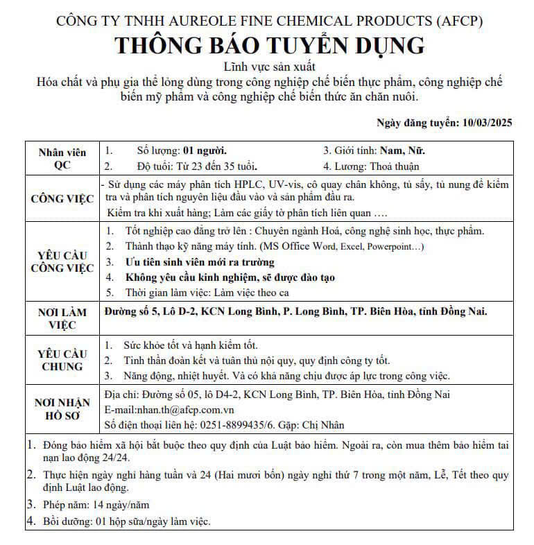 Công Ty TNHH AUREOLE FINE CHEMICAL PRODUCTS (AFCP) tuyển dụng nhân viên ngành Thực phẩm, Hóa, Sinh học