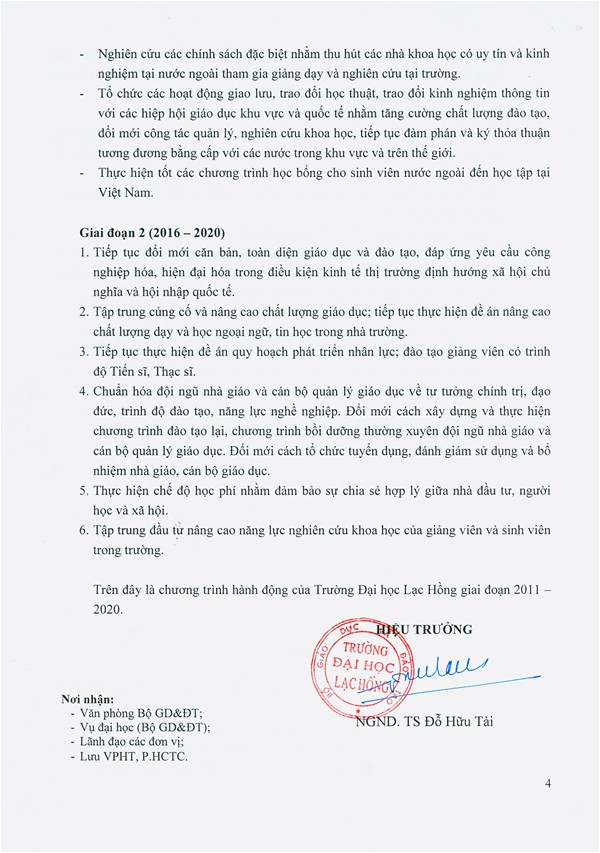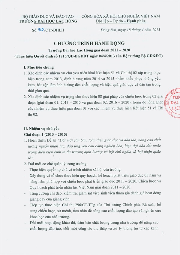 Chương trình hành động Trường Đại học Lạc Hồng giai đoạn 2011-2020