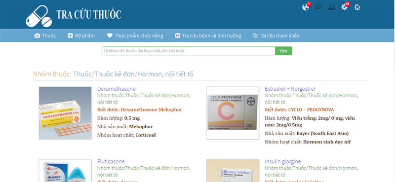Giao diện trang web tra cứu thuốc theo phân loại nhóm dược lý