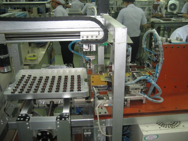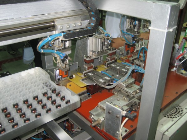 - Sau khi sản phẩm đã ổn định trên băng chuyền, một tay máy khí nén sẽ vận chuyển sản phẩm từ băng chuyền sang máng ngang, mỗi lần chỉ di chuyển một sản phẩm. Sau khi sản phẩm đã ổn định trên máng ngang, cơ cấu răng lược sẽ di chuyển sản phẩm đến các vị trí kiểm tra lỗi A, một thiết bị kiểm điện do Nec Tokin cung cấp (gọi tắt là TBK) sẽ báo rằng sản phẩm là OK hay NG. Nếu OK thì sản phẩm sẽ tiếp tục qua phần kiểm tra lỗi B, còn nếu NG thì sản phẩm sẽ được một cylinder đẩy ra thùng lỗi A. Tại vị trí kiểm tra lỗi B, nếu OK thì sản phẩm sẽ được đẩy qua phần cuối của máng chờ cho tay máy gắp đi, còn nếu NG thì sản phẩm sẽ được một cylinder đẩy ra thùng lỗi B.