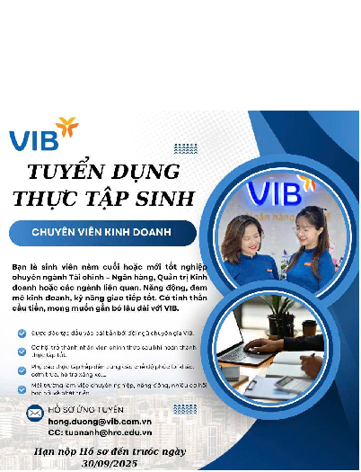 Thông báo tuyển dụng lần thứ 25, năm học 2025 - 2026. Ngân hàng VIB
