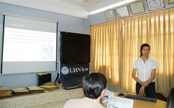 Đề tài đầu tiên tham gia báo cáo là “Nghiên cứu và ứng dụng Kinect vào trình chiếu tài liệu” của nhóm sinh viên Trần Việt Đức và Trương Minh Hiếu, cũng là đề tài được chọn gửi lên Hội nghị báo cáo NCKH cấp trường