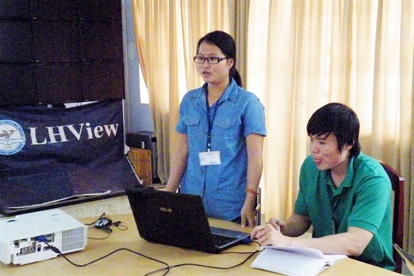 Nhóm sinh viên Lê Thị Hảo và Nguyễn Thị Kim Dung trình bày đề tài “Phương pháp thêm dấu tiếng Việt vào văn bản tiếng Việt không dấu”.