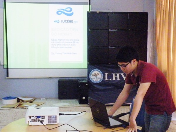 Sinh viên Vương Trần Hoài Nam, trình bày đề tài “Nghiên cứu ứng dụng mã nguồn mở Lucene để xây dựng phần mềm tìm kiếm thông tin trên văn bản”.