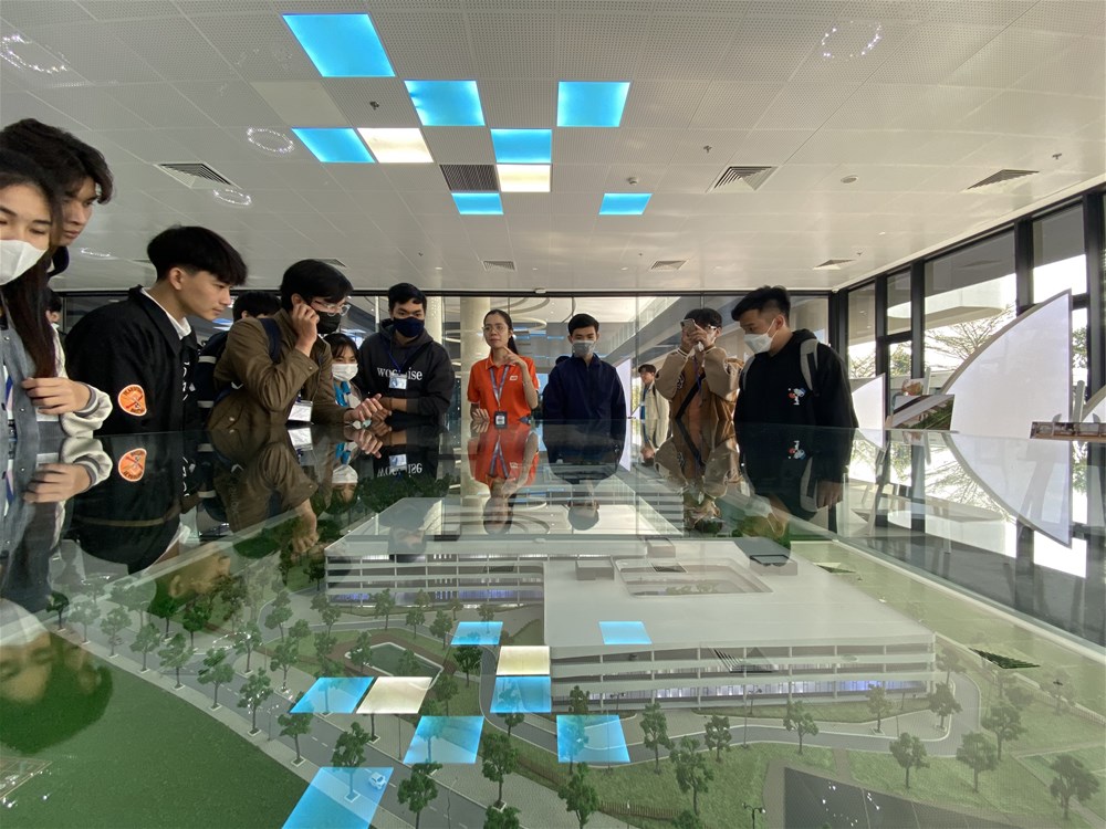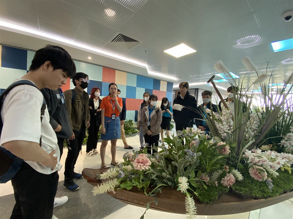 Chị Thuỷ Tiên (áo cam) chuyên viên cấp cao tại Công ty trực tiếp giới thiệu, hướng dẫn sinh viên tham quan tại FPT