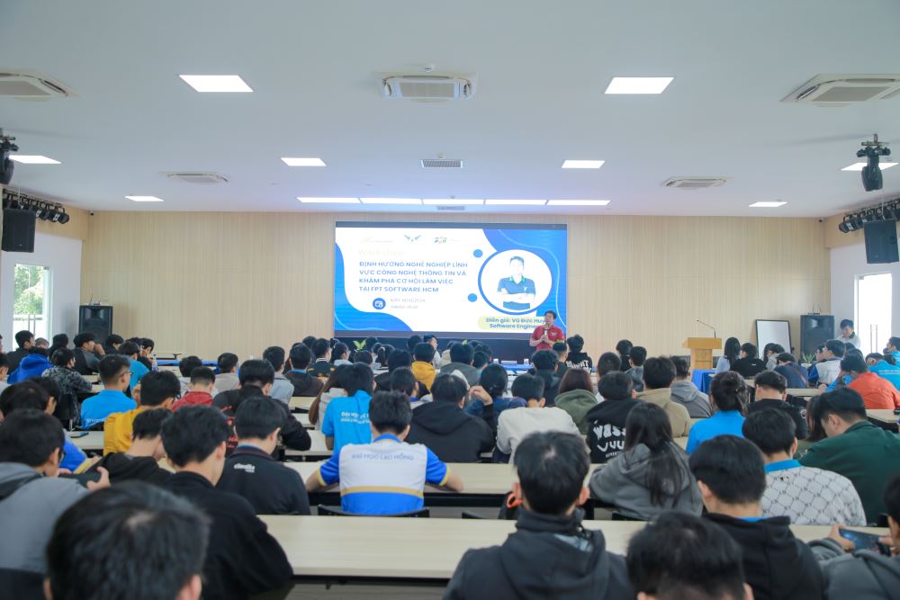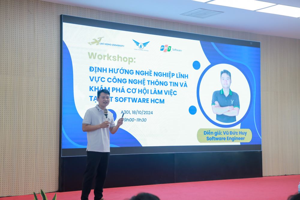Sáng ngày 18/10/2024, workshop với chủ đề "Định hướng nghề nghiệp CNTT -  Khám phá cơ hội làm việc tại FPT Software HCM" đã được tổ chức thành công tại Hội trường A301, Trường Đại học Lạc Hồng. Sự kiện là cơ hội để sinh viên Khoa Công nghệ Thông tin (CNTT) và các bạn trẻ đam mê công nghệ được giao lưu, học hỏi từ các chuyên gia hàng đầu trong ngành.
