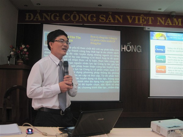 Học viên Nguyễn Văn Tín báo cáo đề tài "Một số giải pháp hoàn thiện công tác tuyển dụng và đào tạo nguồn nhân lực tại Công ty Cổ phần Chăn nuôi CP Việt Nam"