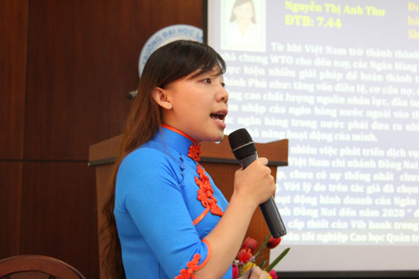 Học viên Nguyễn Thị Anh Thư báo cáo đề tài "Một số giải pháp phát triển hoạt động kinh doanh của Ngân hàng TMCP Quốc tế Việt Nam chi nhánh Đồng Nai đến năm 2020"