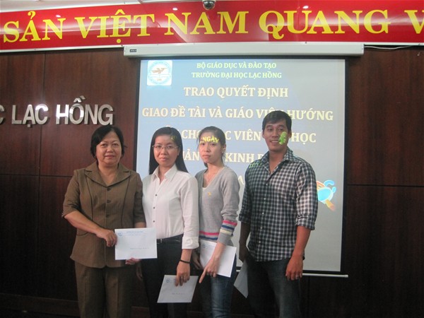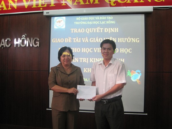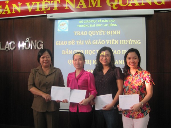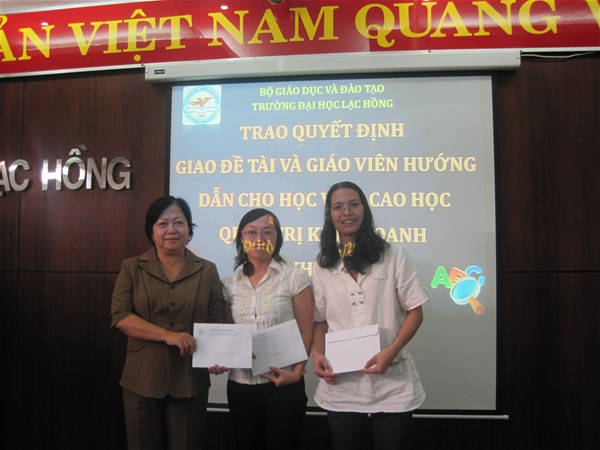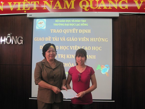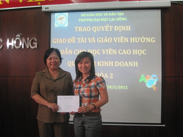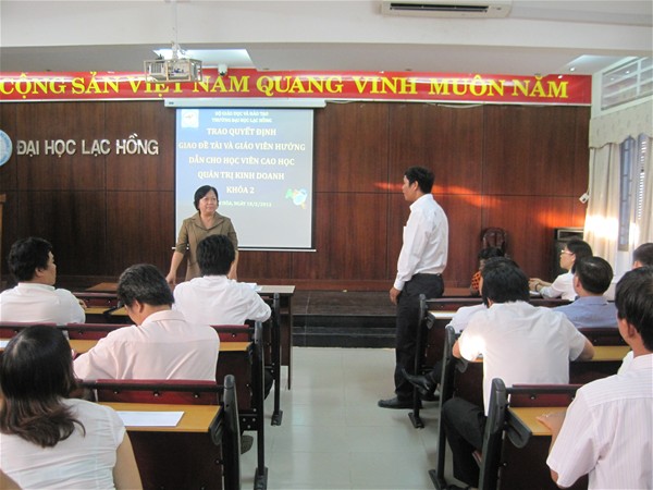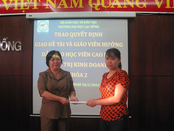 Chiều ngày 17/02/2012, Phòng Sau đại học Trường Đại học Lạc Hồng đã tổ chức lễ trao quyết định giao đề tài luận văn thạc sĩ và giảng viên hướng dẫn khoa học đợt 2 cho học viên lớp cao học khóa 2 của hai ngành Quản trị kinh doanh và Công nghệ thông tin.Đến tham dự buổi lễ có cô Ths Lê Thu Thủy - Phó trưởng phòng NCKH - Sau đại học - KĐCL, các thầy cô thuộc phòng NCKH - Sau đại học - KĐCL, cùng đông đảo các học viên cao học khóa 2.